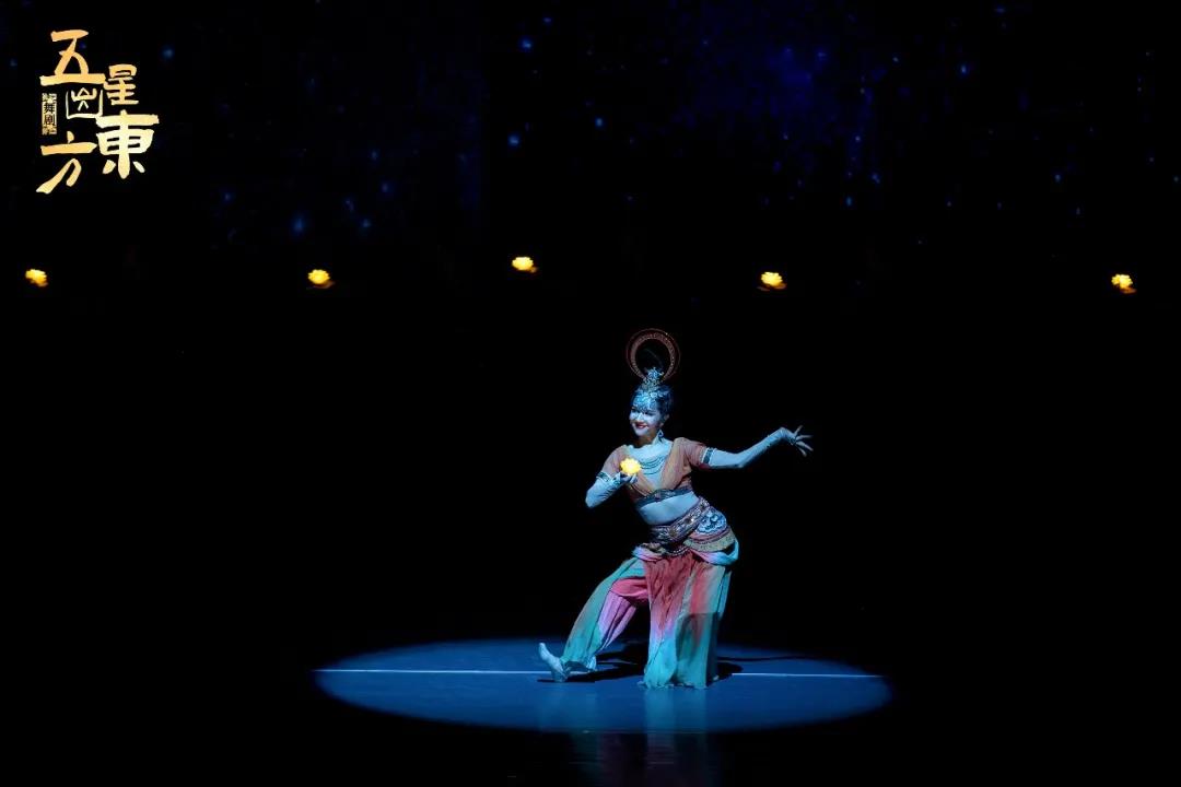 舞劇《五星出東方》中“燈舞”舞段又名《遠古的呼喚》,這段舞蹈是參考絲綢之路上克孜爾石窟中“龜茲壁畫”里“伎樂天人”的姿態與動作,是一段以龜茲樂舞為基礎,結合當代舞蹈語言進行藝術創作與加工而來,豐富的舞蹈內涵和肢體語言,最終呈現為劇中西域風情濃郁、姿態優雅曼妙的“燈舞”。
